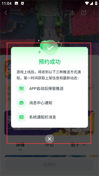 4、预约成功后会弹出提示框,说明游戏上线后会通过多种推送方式通知,这样就不会错过游戏上线啦。