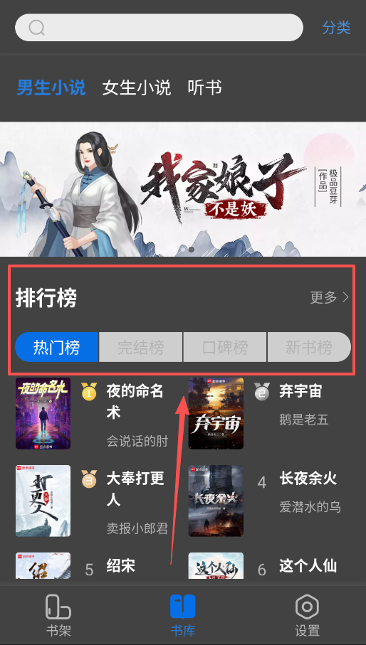 1、首先打开软件后,底部有书架、书库、设置三个主要入口,点击书库就能看到男生小说、女生小说和听书等分类。
