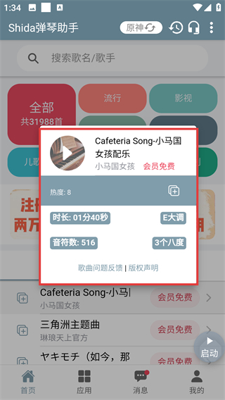 2、点歌曲后弹出的详情框里,能看到歌曲的热度、时长等信息,了解后可继续后续的弹奏设置哦。
