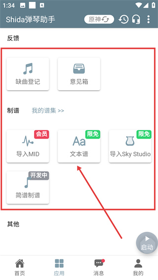 3、点底部的【应用】选项,进入应用页后选【文本谱】功能,能进入文本谱编辑界面,准备导入乐谱啦。