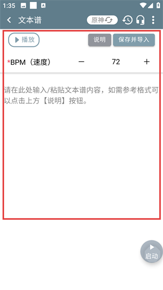 4、在文本谱界面输入或粘贴乐谱内容,调整【BPM-速度】后点【保存并导入】,就能将乐谱导入使用啦。