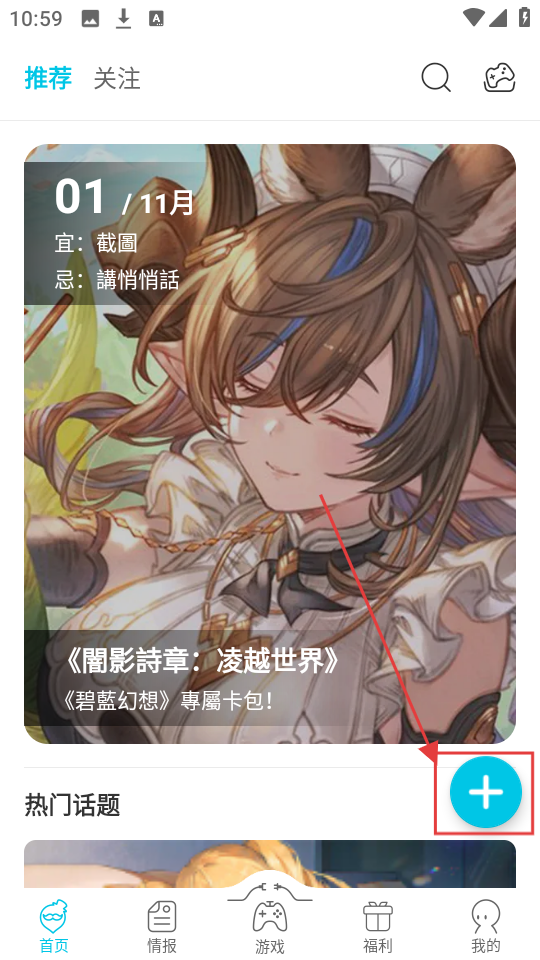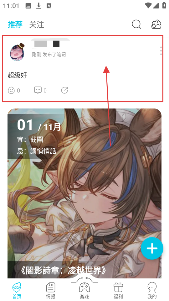 1、首页点蓝色【+】号,可进入发布笔记页面,分享你的游戏心得哦。