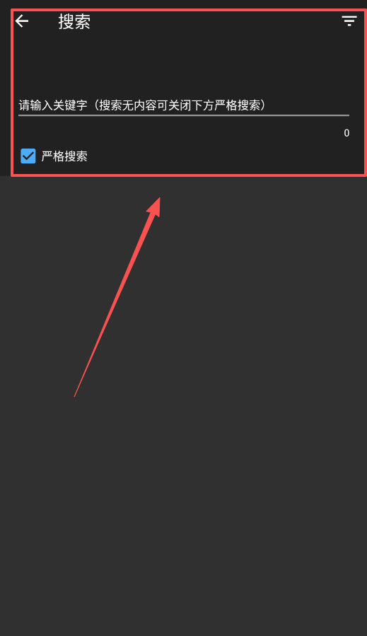 3、然后是漫画的搜索功能,在应用内的搜索框输入想看的漫画名字,如果找不到,可以尝试开启下方的“严格搜索”选项。