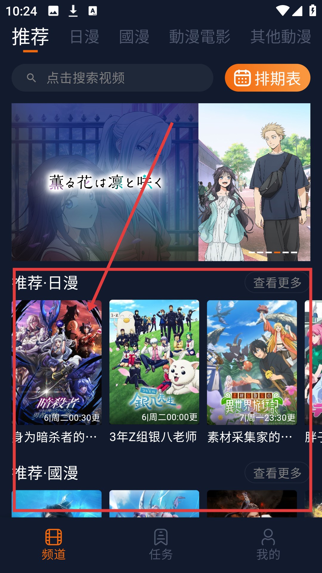 1、在软件频道页面,可浏览推荐的日漫、国漫等,选择感兴趣的动漫,如《身为暗杀者的我明显比勇者还强》,进入其详情页啦。