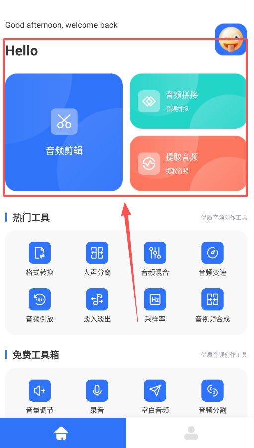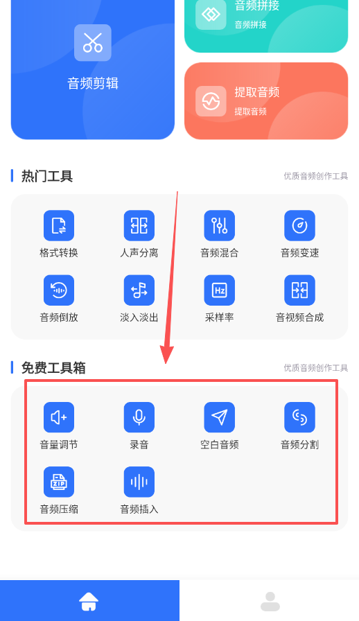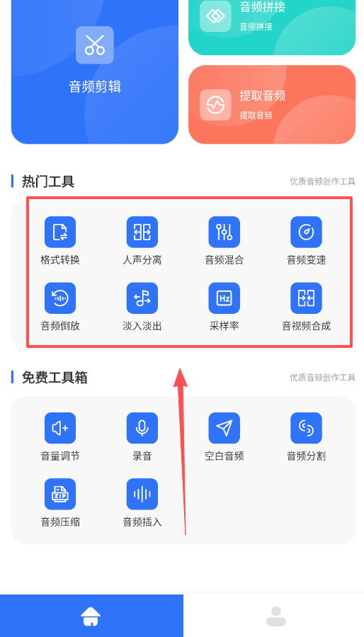1、音频剪辑与拼接呢,首先打开软件在首页找到音频剪辑或音频拼接功能,点击进入后选择需要处理的音频文件。