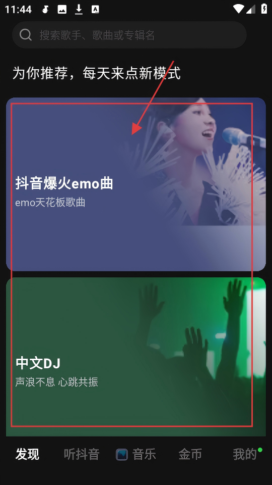 1、在APP发现页,有【抖音爆火emo曲】【中文DJ】等推荐板块,选喜欢的板块,能快速找到心仪音乐呢。