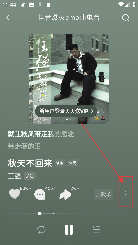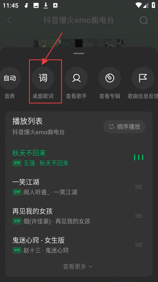 2、进入【抖音爆火emo曲电台】,播放歌曲时,点击右侧三点图标,能展开更多操作选项,超方便的。