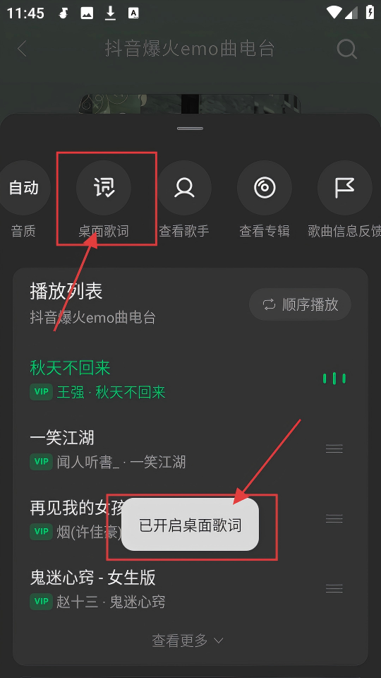 4、点击【桌面歌词】后,界面会提示已开启桌面歌词,这样就能在桌面看到歌词,提升听歌体验咯。