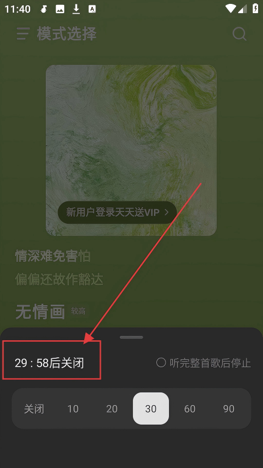 4、选好定时时长,像30分钟,界面会显示剩余关闭时间,到点后音乐就会自动关闭,很贴心哦。