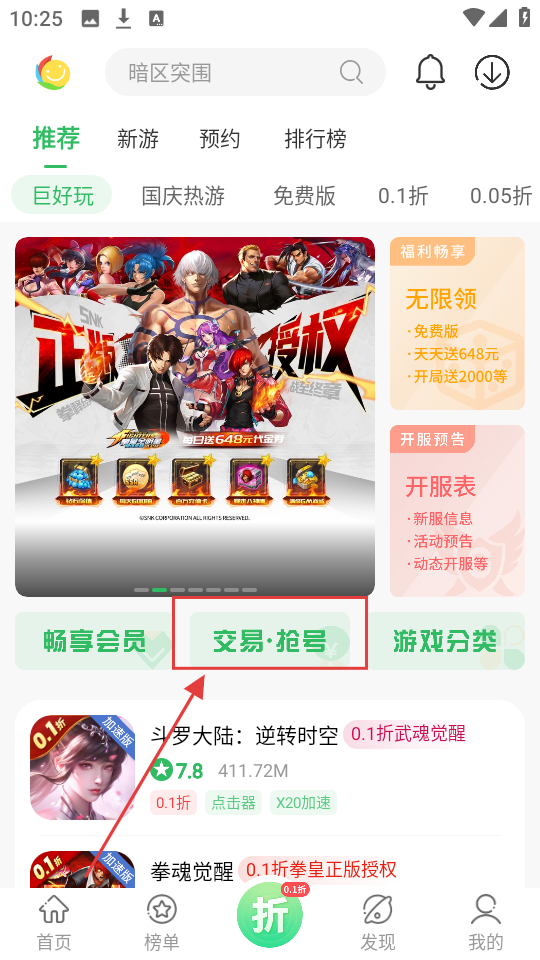 1、折扣页的【交易抢号】功能别忽略,想交易游戏账号就点它,快去看看吧。