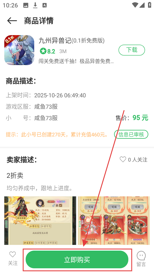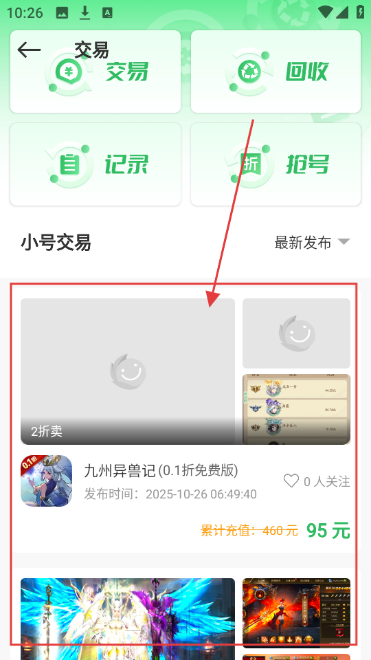 2、交易界面有小号交易板块,像【九州异兽记(0.1折免费版)】就很划算,瞧瞧哦。