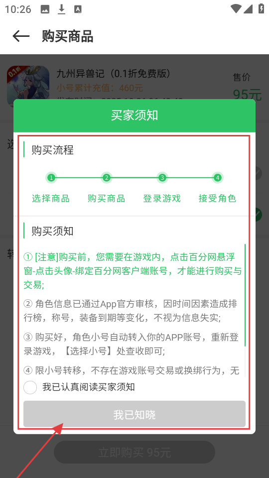 4、购买前要仔细阅读买家须知,勾选确认后点【我已知晓】,这样才能完成购买哦。