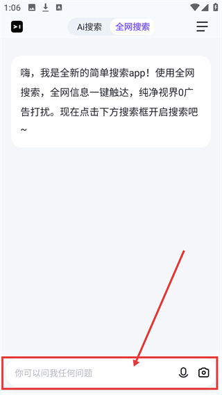 1、在简单搜索app首页,点底部搜索框输入关键词,就能开启全网搜索,获取对应的信息内容啦。