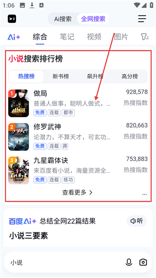 2、搜索结果页会展示相关内容,像【小说搜索排行榜】里的热门作品,选目标小说就能进入详情页哦。