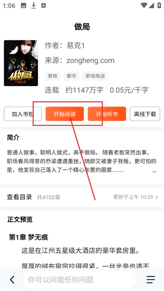 3、在小说详情页,点【开始阅读】按钮,就能进入正文阅读页面,开始浏览小说内容啦。