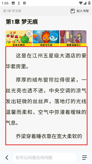 4、进入小说阅读页后,就能查看章节内容,还能点右上角【加入书架】,方便后续快速找到该小说呢。