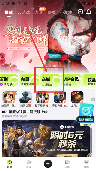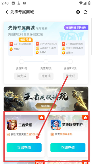 1、点击【商城】,进入先锋专属商城界面,可进行游戏充值等操作哦。