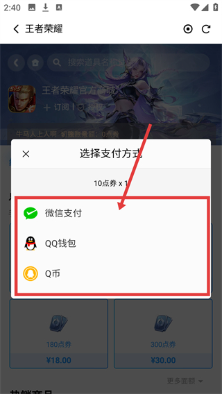 3、在充值界面选点券面额,点击即可进入支付方式选择界面哦。