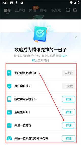 2、进入新手任务页面后,可看到多个任务,如关注一款游戏等,点击任务右侧【前往】,可进入对应任务的操作页面哦。
