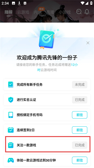 4、完成关注游戏任务后,回到新手任务页面,可看到【关注一款游戏】任务显示已完成,继续完成其他任务还能获取更多奖励哦。