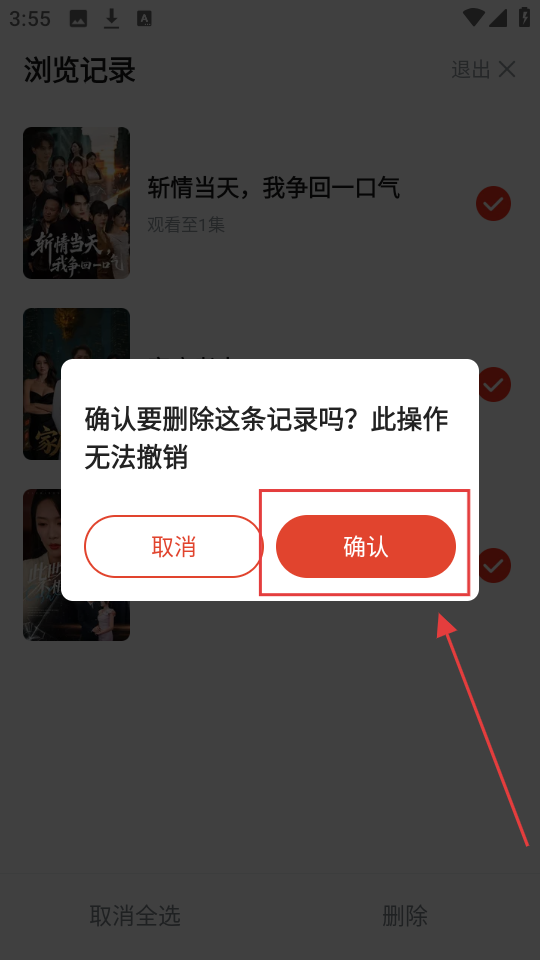 3、选好要删除的记录后,点击【删除】按钮,这时会弹出确认框,我们点击【确认】,就能把选中的记录删掉啦。