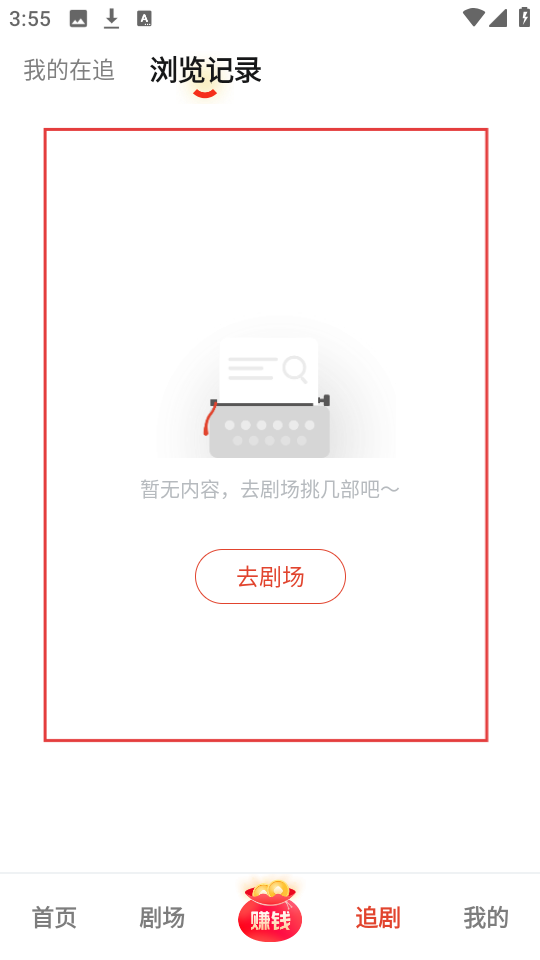 4、删除完成后,浏览记录界面就会显示“暂无内容,去剧场挑几部吧~”,要是还想看剧,就点击【去剧场】按钮去挑选。