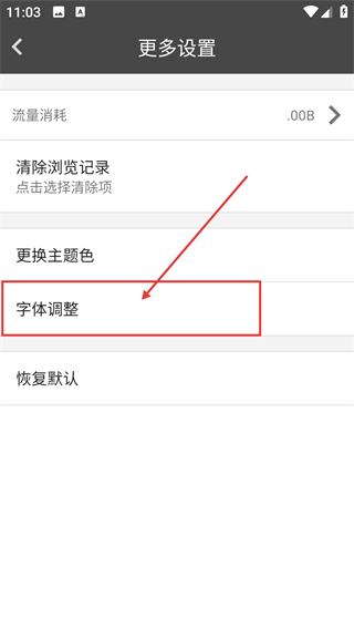 3、在更多设置页,点击【字体调整】选项,就能打开字体大小的选择弹窗啦。