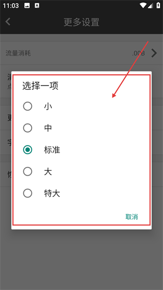 4、在字体选择弹窗里,挑选【小/中/标准/大/特大】任一选项,就能完成字体大小的调整啦。
