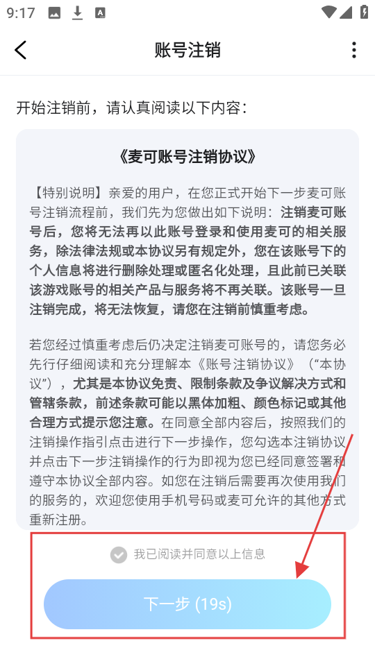 4、账号注销页面阅读并同意协议后,点【下一步】,就能继续注销操作,是不是很简单呀。