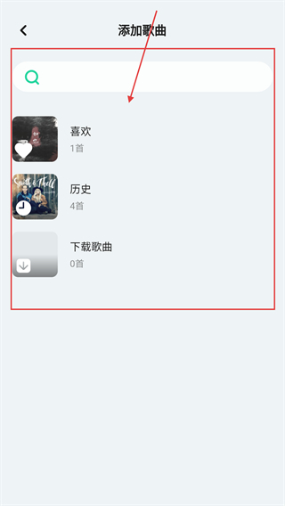 4、在添加歌曲页,可选择【喜欢】【历史】等分类,从中挑选歌曲加入刚创建的歌单哦。