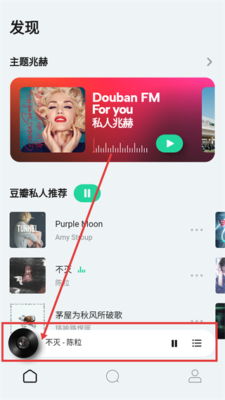 1、在【DoubanFM】的发现页,点击底部播放栏的歌曲条目,进入该歌曲的详情播放界面,可进行更多操作啦。