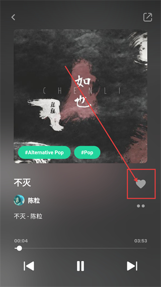 2、进入歌曲播放页后,点击右侧的心形按钮,即可将当前歌曲添加到【喜欢】列表中,方便后续重温哦。