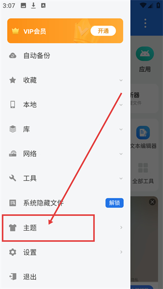 2、展开侧边栏后,点【主题】选项,能进入主题设置界面,更换应用的显示风格啦。