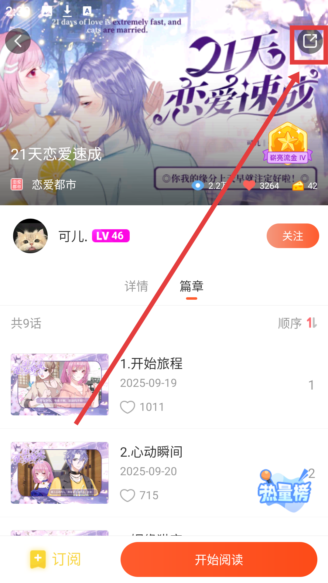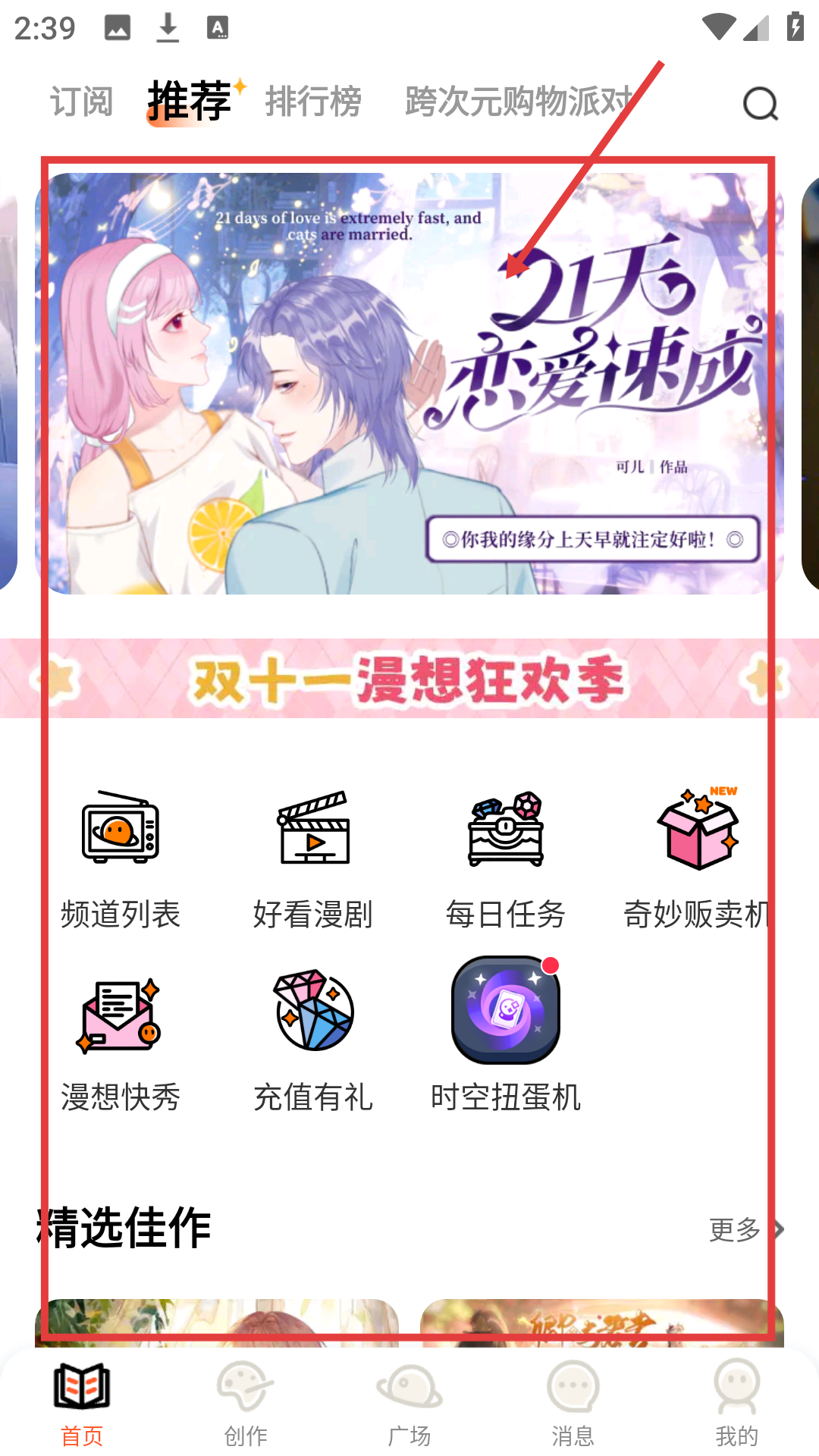 1、在软件首页推荐板块,点击《21天恋爱速成》的封面,可进入该作品详情页啦。