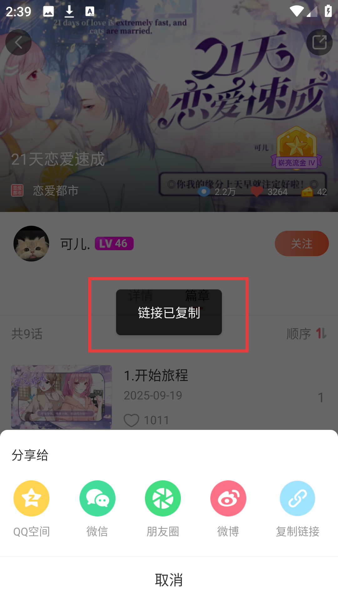 4、复制链接后,会提示链接已复制,此时可将链接分享到其他平台,让更多人看到该作品哦。