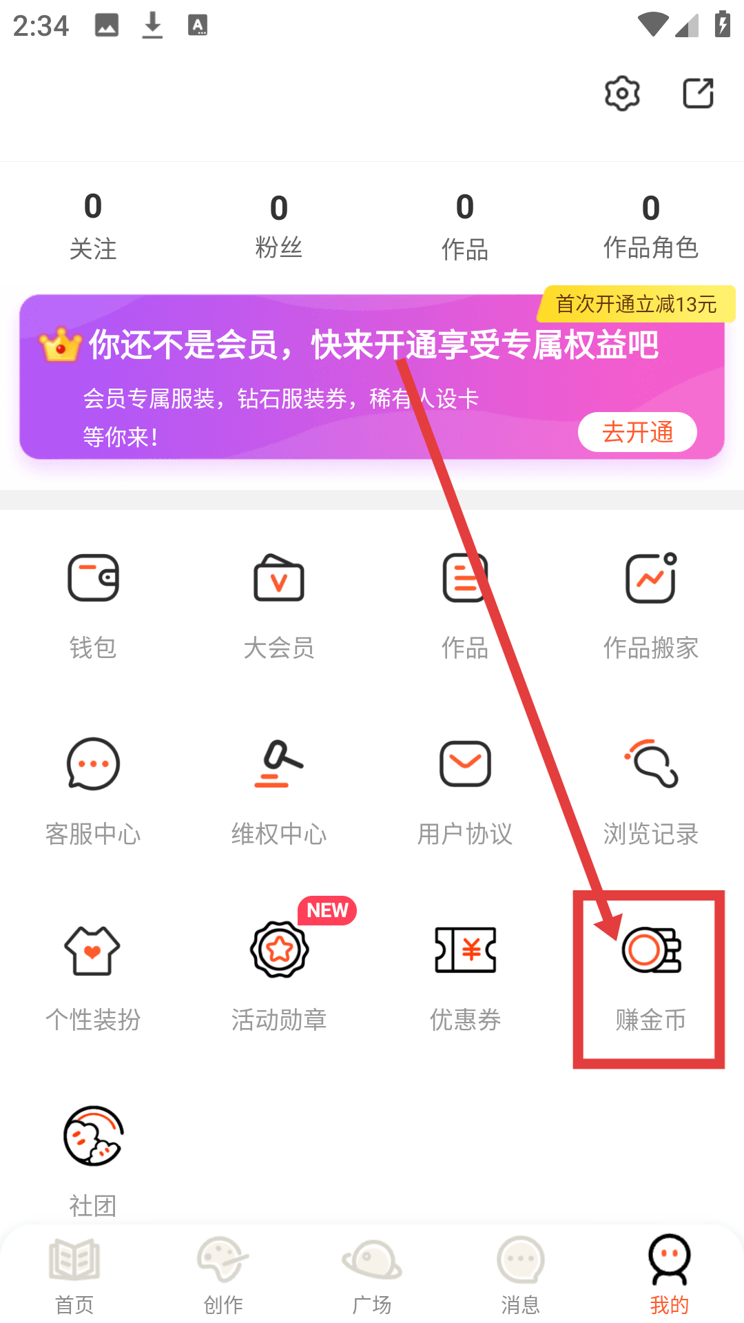 1、在“我的”页面点击【赚金币】选项,进入赚金币页面可做任务赚金币哦。