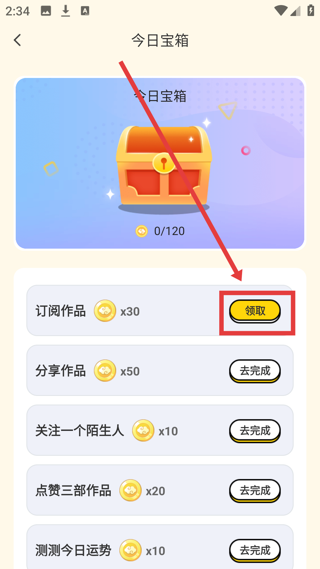 4、完成订阅作品任务后,回到赚金币页面点击“领取”,即可领取30金币啦。