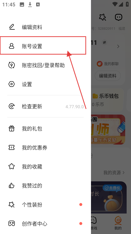 2、在展开的侧边栏里,点击【账号设置】选项,就可以进入账号相关的设置页面啦。