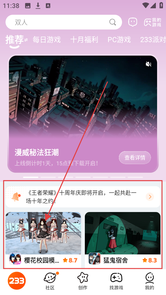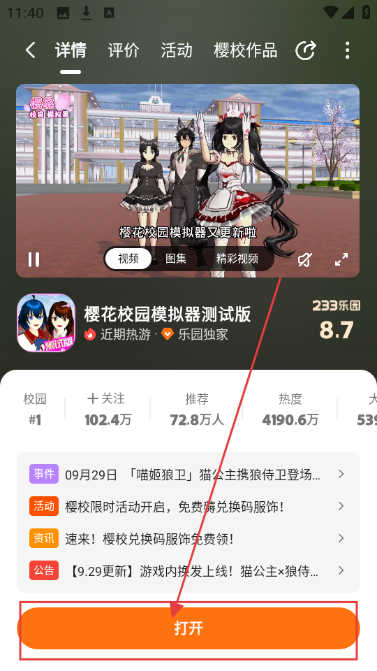 1、我们打开233乐园后,在推荐页面看到【樱花校园模...】,点击它就能进入游戏详情页啦。