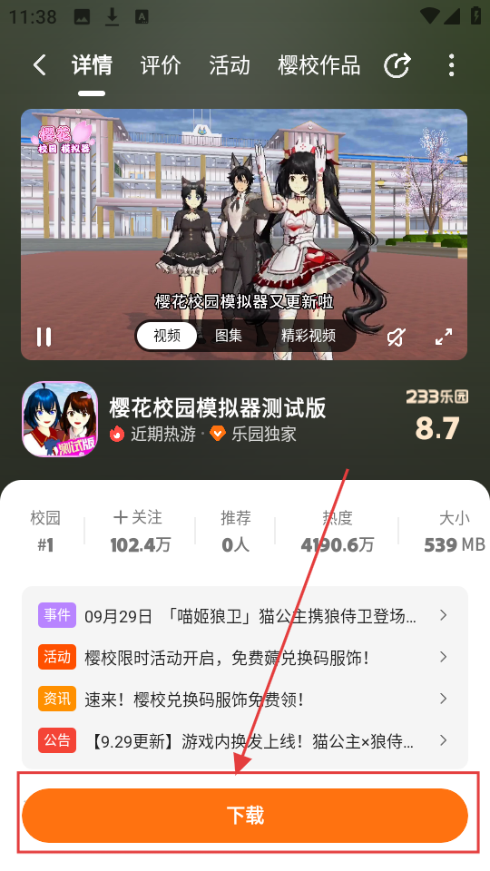 2、进入樱花校园模拟器游戏详情页,我们点击【下载】按钮,就可以开始下载游戏啦。