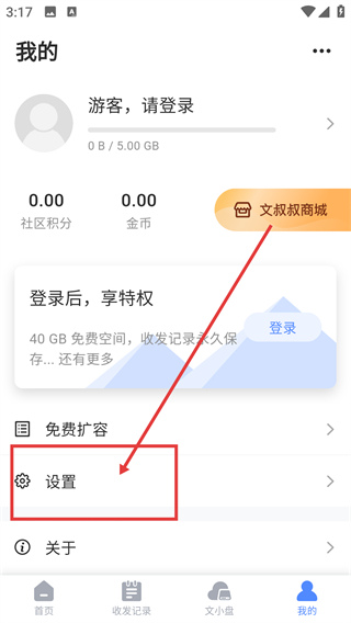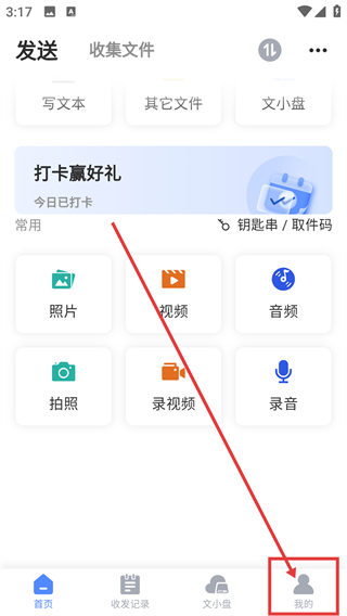 1、在文件发送页面点击底部的【我的】选项,就能进入个人中心界面,查看账号及功能设置入口啦。