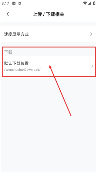4、进入上传/下载相关页面后,可点击【默认下载位置】选项,修改文件下载的存储路径哦。