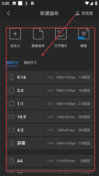 2、在新建画布页选择心仪的预设尺寸,比如【9:16】,即可创建对应尺寸的画布进入编辑界面啦。