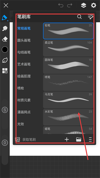 3、在画布编辑页点击左侧工具栏的笔刷按钮,打开笔刷库界面,可挑选不同类型的笔刷哦。