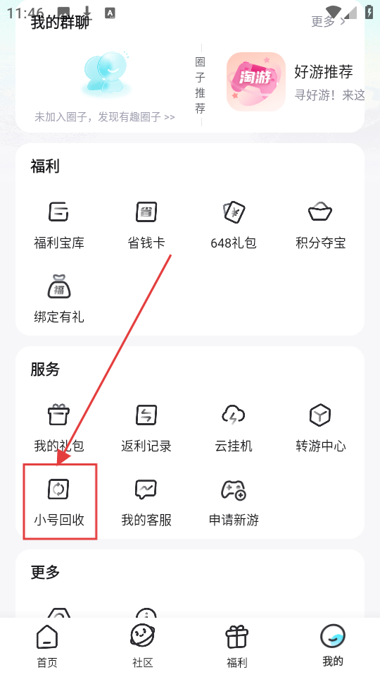 2、在个人中心页面,找到【小号回收】选项并点击,进入小号回收页面,可查看是否有小号可回收哦。