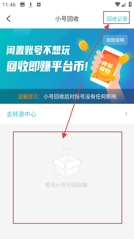 3、在小号回收页面,能看到是否有闲置小号可回收,若想查看回收历史,可点击【回收记录】呢。