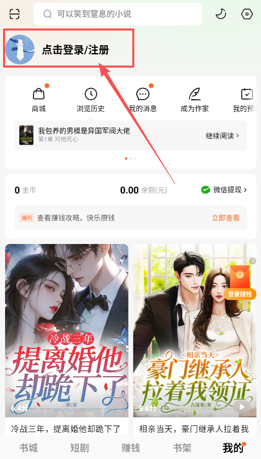 1、注册登录就有福利,打开软件后点击屏幕上的“点击登录/注册”,还能在“我的”页面查看金币余额和提现途径呢。