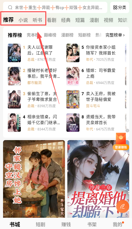 2、首页找书快速又精准,进入“书城”页面,顶部分好了“推荐、小说、听书”等频道,下方还有各类排行榜单。