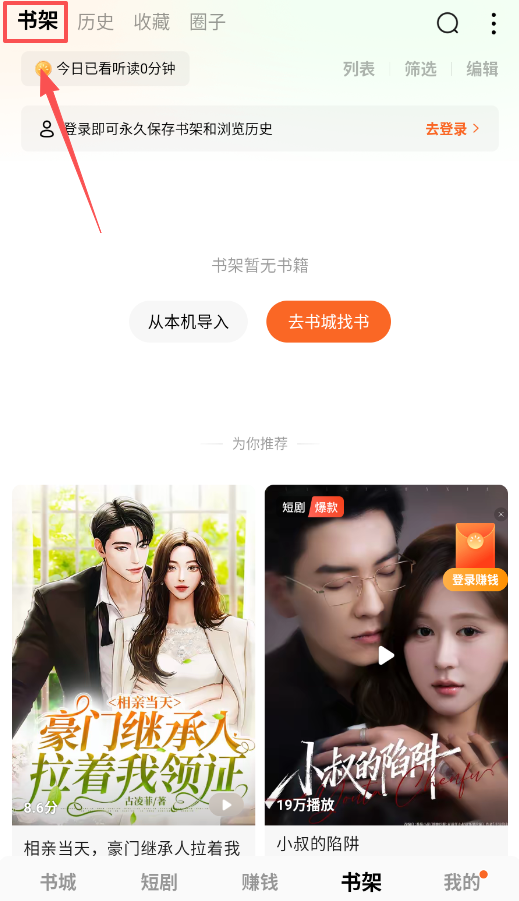 3、书架管理你的私人书库,点击底部“书架”图标,登录后可以点击“从本机导入”或“去书城找书”来添加作品。