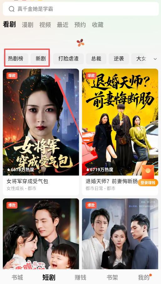 4、短剧漫剧专区别错过,切换到“短剧”页面,这里有“热剧榜、新剧”等分类,像“女将军穿成受气包”这类爆款剧集可以直接免费观看。